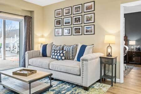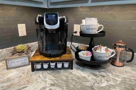 Sofa pulls out to a comfortable queen bed with a gel mattress. Black-out curtains are in the suite.