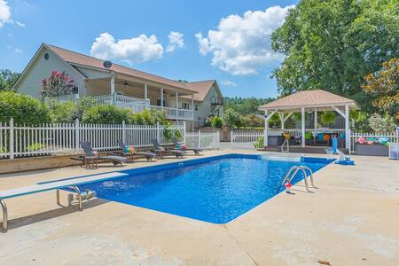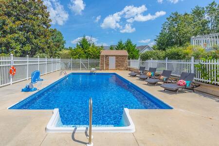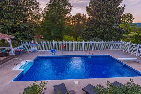 There are beautiful magnolia trees and mountain views from the pool. It is cleaned and chemicals are balanced very frequently. We also use a mechanical pool cleaner which is in the deck box in the gazebo. We take care of all pool maintenance. The pool area is fenced for safety. There is a lock on the inside of the gate.