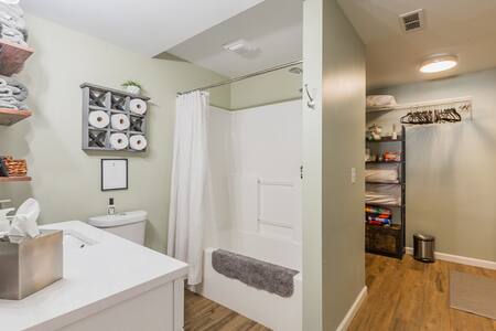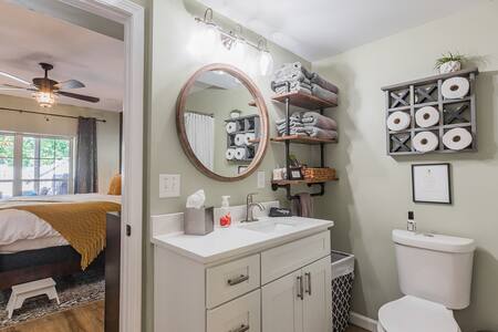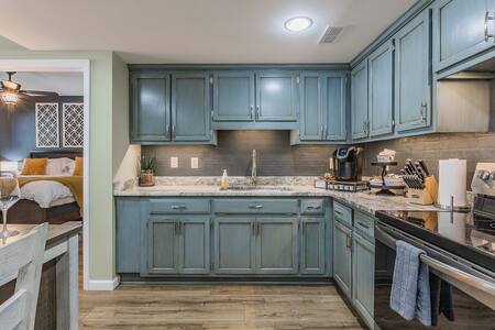 Make yourself at home in this charming lower-level guest suite. A Suite Retreat features a full kitchen, cozy living room, comfortable bedroom, spacious bathroom, and private laundry room—everything you need for a relaxing and convenient getaway.