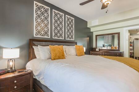 The bedroom has an incredibly comfortable king-size mattress with a 3” memory foam topper, 2 nightstands, a luggage rack, and a large dresser with a mirror.