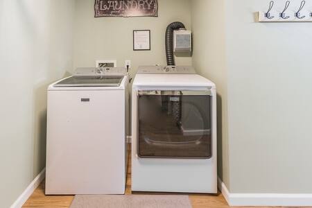 There is a washer and dryer available along with the supplies needed to do laundry. There is also an iron and ironing board in case you need to get really fancy. 😉 Non-slip and pant hangers are there if you want to use them.