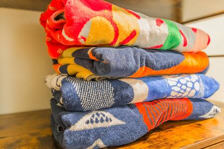The bathroom has a blow dryer, a handheld mirror, and shelves full of towels, washcloths, and hand towels.