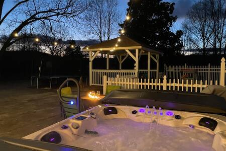 The hot tub is open year-round. It seats up to 6 people. It is WONDERFUL!